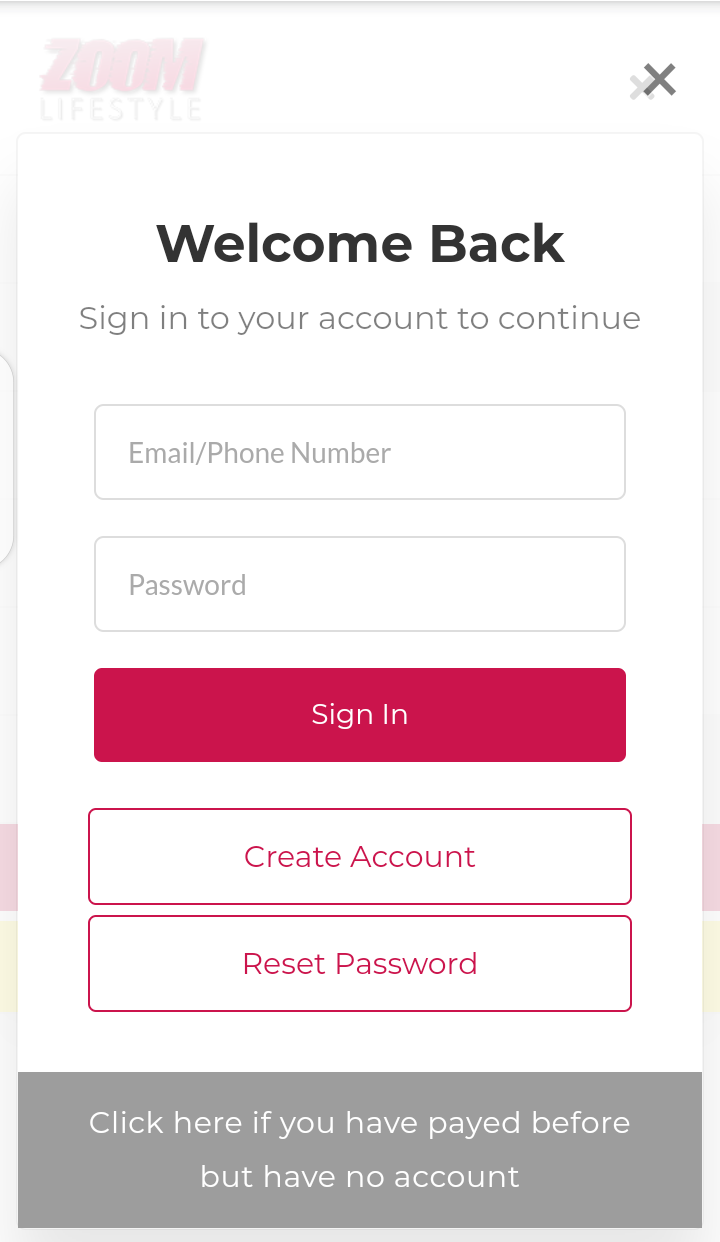 Visit the Zoom Lifestyle homepage and click the “Triple bar ☰ Button” found at the top right corner of the website, a page comes out of which you would need to click on “Create Account” to register.